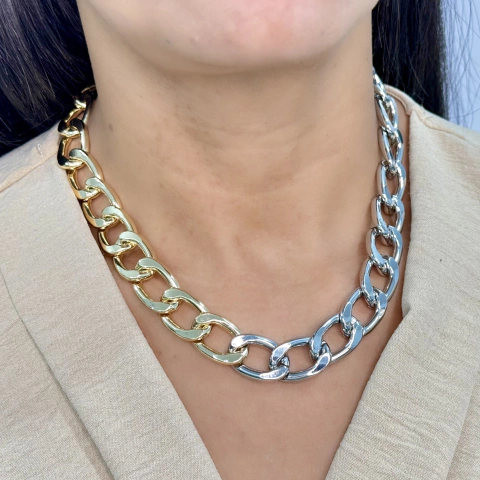 Este colar correntaria mix folheado é o acessório ideal para quem busca uma peça versátil e cheia de estilo. Com elos robustos e uma combinação sofisticada de dourado e prata, ele é perfeito para adicionar um toque moderno e elegante a qualquer visual. O acabamento folheado de alta qualidade garante durabilidade e brilho, tornando este colar uma escolha tanto para eventos formais quanto para o dia a dia. O design de correntes é tendência, oferecendo um estilo arrojado e contemporâneo.